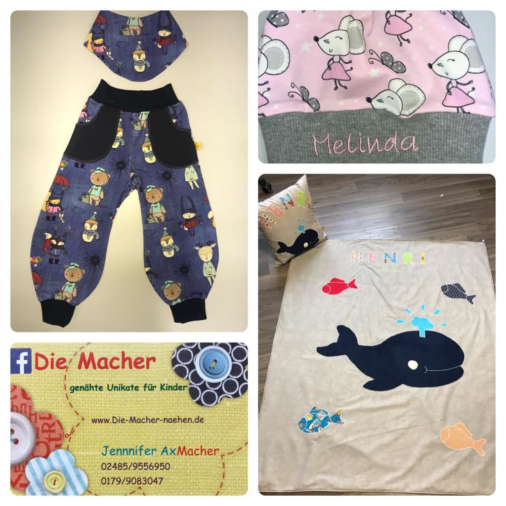Seit 2013 nähe ich Kinderkleidung wie zum Beispiel Pumphosen, Halstücher, Pullover, Mützchen, Beanis,Loops, Decken und Kissen nach ihren Wünschen. Jedes Teil ist ein Unikat und kann sich anhand unserer Stoffauswahl zusammengestellt werden. Durch meine Stickmaschine kann ich jedes Teil noch durch Namen personalisieren. Ebenfalls habe ich einen kleinen Laden in dem immer etwas nettes zur Verfügung ist, falls kurzfristig ein Geschenk zur Geburt benötigt wird. Ich kann ihnen gerne die benötigte Größe dann über Email oder WhatsApp zukommen lassen.